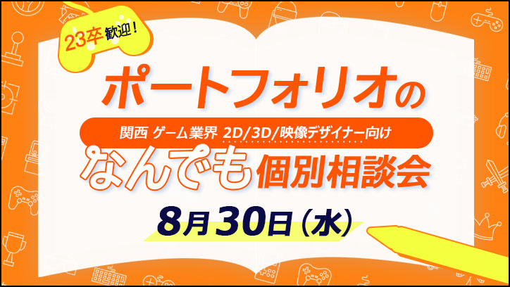 【23卒歓迎!】関西 ゲーム業界 2D/3D/映像デザイナー向け ポートフォリオのなんでも個別相談会 8月30日(水)