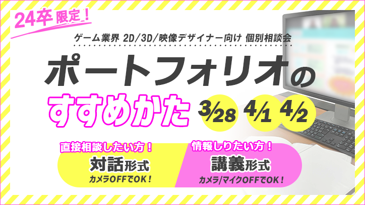 【24卒限定!】ゲーム業界 2D/3D/映像デザイナー向け ポートフォリオのすすめかた個別相談 3月28日(木)4月1日(月)4月2日(火)